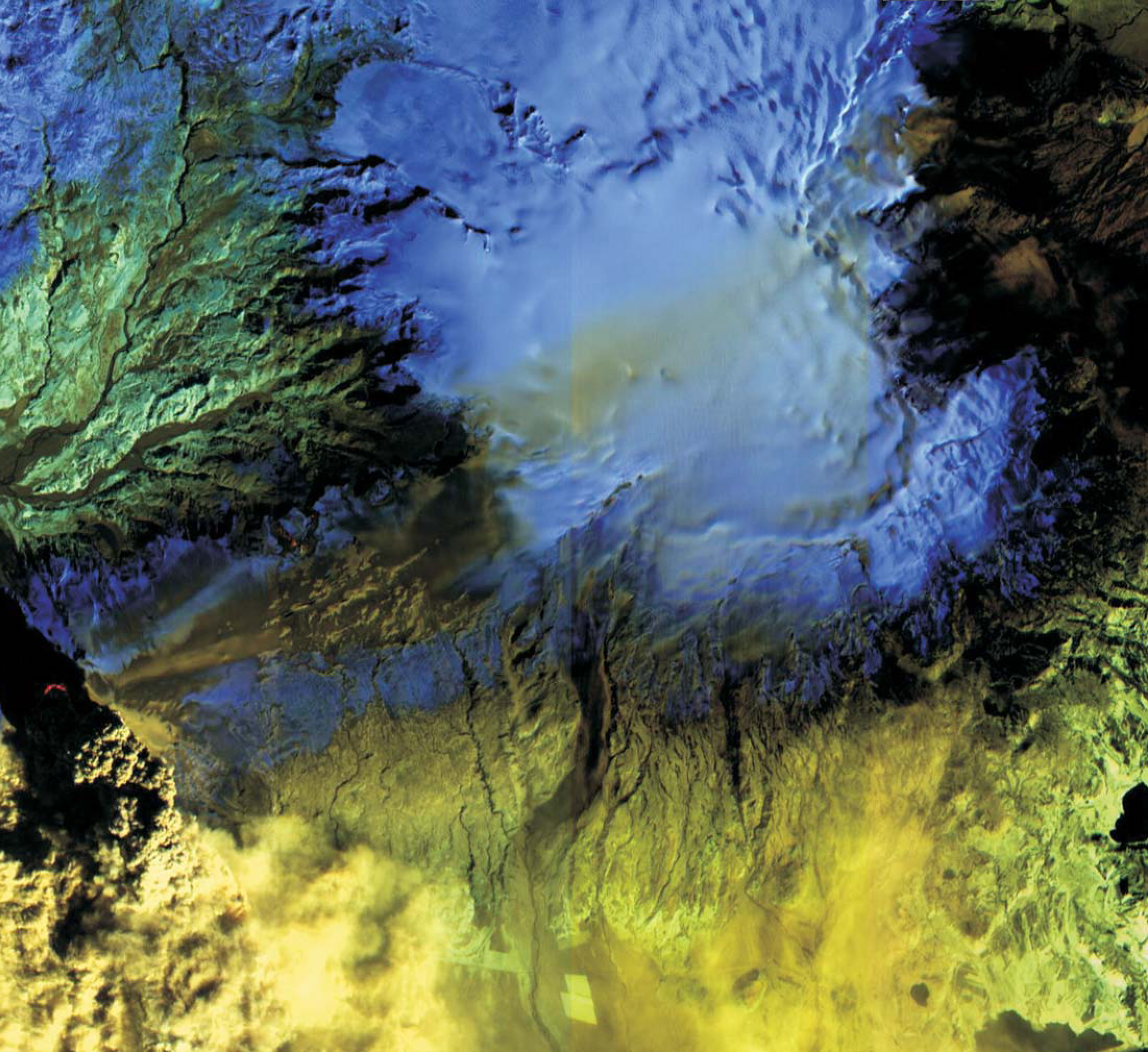 As Physics Today, went to press, Eyjafjallajökull was still erupting in southern Iceland. Three days after the volcano began its explosive ejection of ash into the jet stream on 14 April 2010, the Advanced Land Imager aboard NASA’s Earth Observing-1 spacecraft obtained this false-color IR image of the volcano and surrounding region. The crater is visible (red, far left) at the base of the massive, dense plume. Above and to the right, the fainter red feature—about 8 km away—marks the lava flows in the mountain pass of Fimmvöröuháls, where the eruption began on 20 March. With no ice cap over the lava fissures there, that initial episode lacked the violent lava-water interaction that contributed to the damaging Eyjafjallajökull plume. Additionally, the Eyjafjallajökull lavas are more viscous than those from Fimmvöröuháls and thus are more efficient at trapping gas, which is released explosively. Farther to the east, ash can be seen partially covering the Mýrdalsjökull ice cap (blue), beneath which slumbers the larger and more dangerous Katla volcano. Each of the three most recent eruptions of Eyjafjallajökull, in 920, 1612, and 1821–23, has triggered subsequent Katla eruptions. Katla, one of the most active volcanoes in Iceland, has been showing signs of unrest since 1999; it last erupted in 1918.