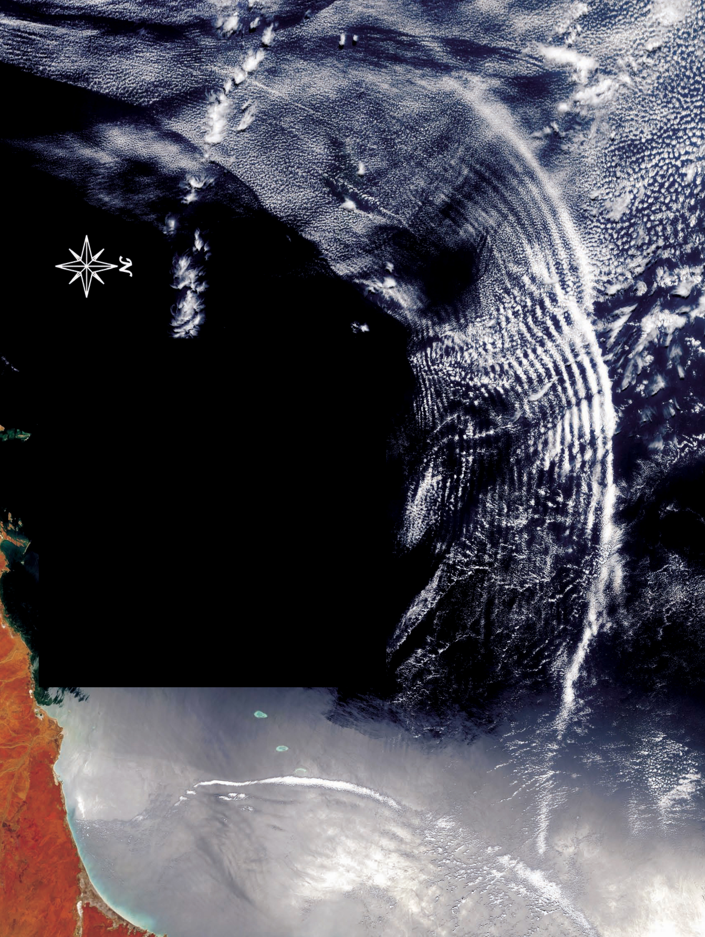 This true-color image of the Indian Ocean off the coast of Eighty Mile Beach in northwestern Australia was taken on 11 November 2003 by the Moderate Resolution Imaging Spectroradiometer (MODIS) aboard NASA’s Terra satellite. (The image has been rotated so that north is to the right.) Overlapping arcs of so-called wave clouds, which can result from atmospheric gravity waves, appear in the right side of the image. Along the bottom, where the Sun glints brightly off the ocean’s surface, atmospheric gravity waves left a lone, curving wave cloud. On the ocean surface, dark lines that parallel the wave cloud show where the atmospheric gravity waves have impressed their pattern onto the water surface. Smaller wave patterns that appear in the sunglint may be internal ocean waves, watery analogues to atmospheric gravity waves.
