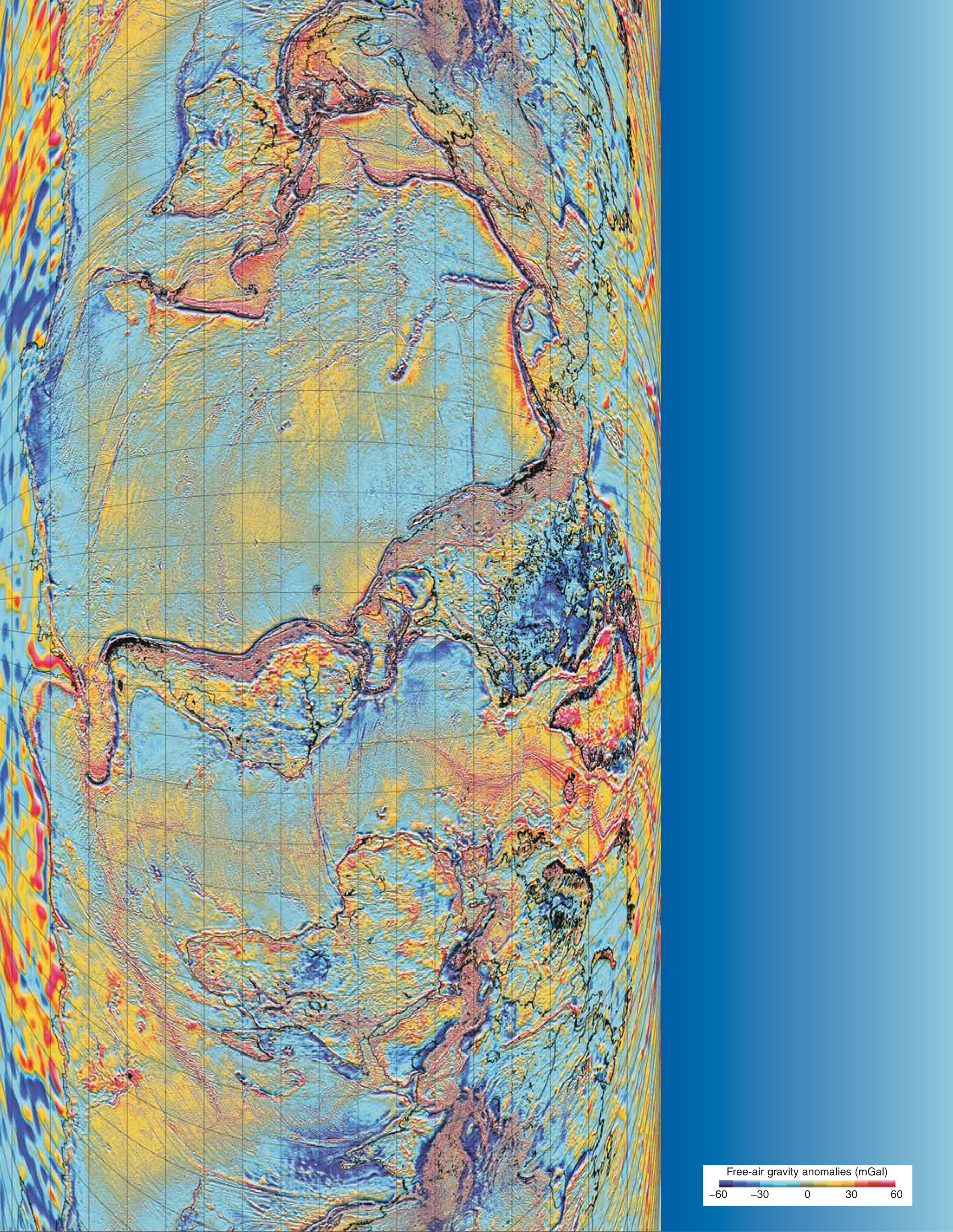 But the actual mean sea level, being subject to dynamic processes such as currents, is more complicated still and doesn’t exactly follow the geoid. So determining local gravity requires that the dynamic surface topography be separated from geoidal undulations. The map shown here does just that. Pulling together geoid models, ocean data from numerous satellites that have measured sea surface heights everywhere, and land data from the US National Geospatial-Intelligence Agency, Ole Andersen and colleagues at the Technical University of Denmark produced a global map, with 1° (2 km) resolution, of local gravity. The so-called free-air gravity anomalies—the deviations of the actual gravity from what it would be if Earth were perfectly ellipsoidal—are plotted here in milligals, or 0.001 cm2/s; 3 mGal corresponds to a 10-m difference in the height of the geoid with respect to a reference ellipsoid. The map improves on previous ones especially at short length scales and in polar and coastal regions.