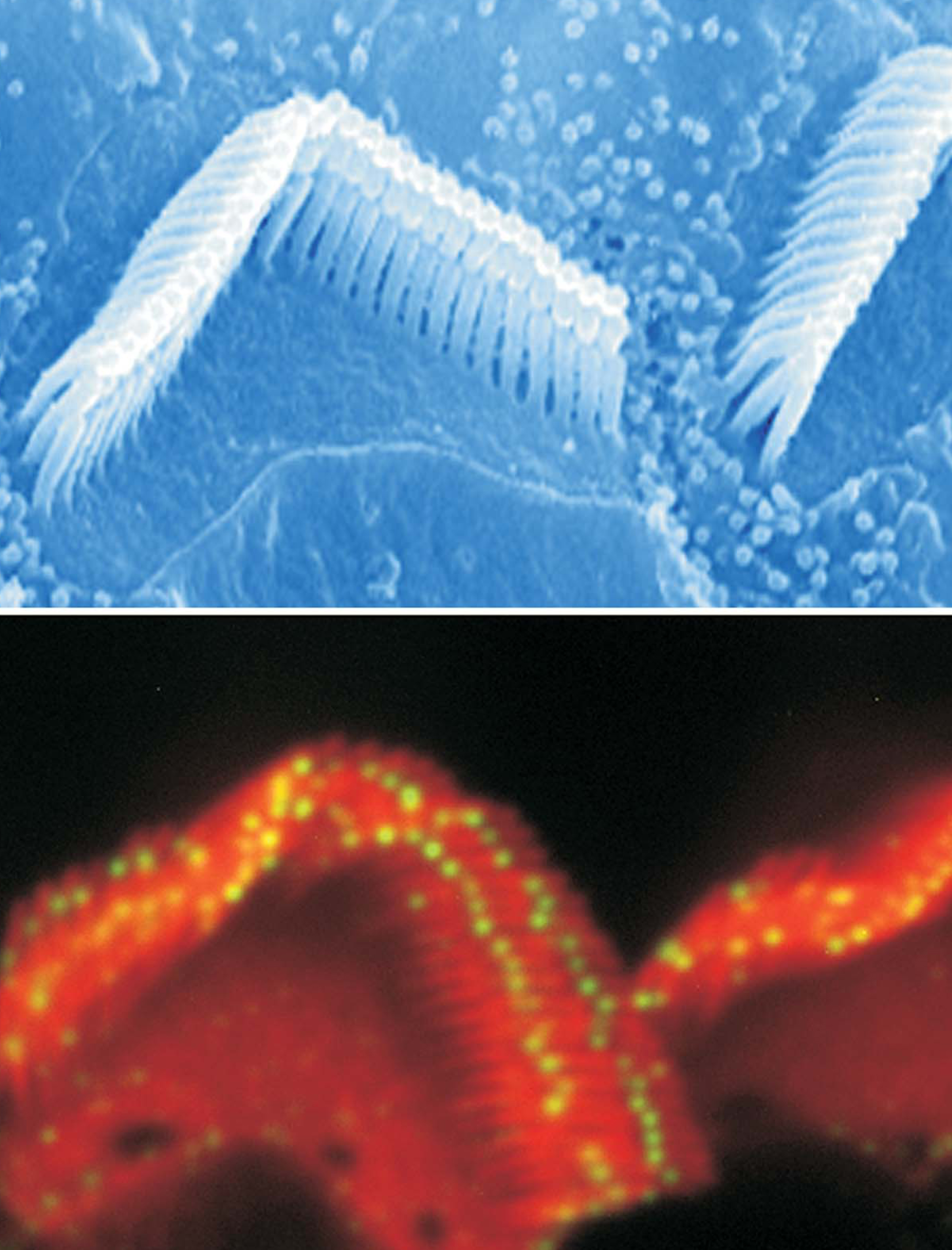 New work by Bechara Kachar (National Institute on Deafness and Other Communication Disorders), Ulrich Müller (Scripps Research Institute and the Institute for Childhood and Neglected Diseases in La Jolla, California), and their coworkers has shown that two members of the cadherin family of transmembrane proteins constitute the tip links. Cadherin 23, tagged with a green fluorescent antibody in the fluorescence microscopy image (bottom), is found at the tall end of the tip link.