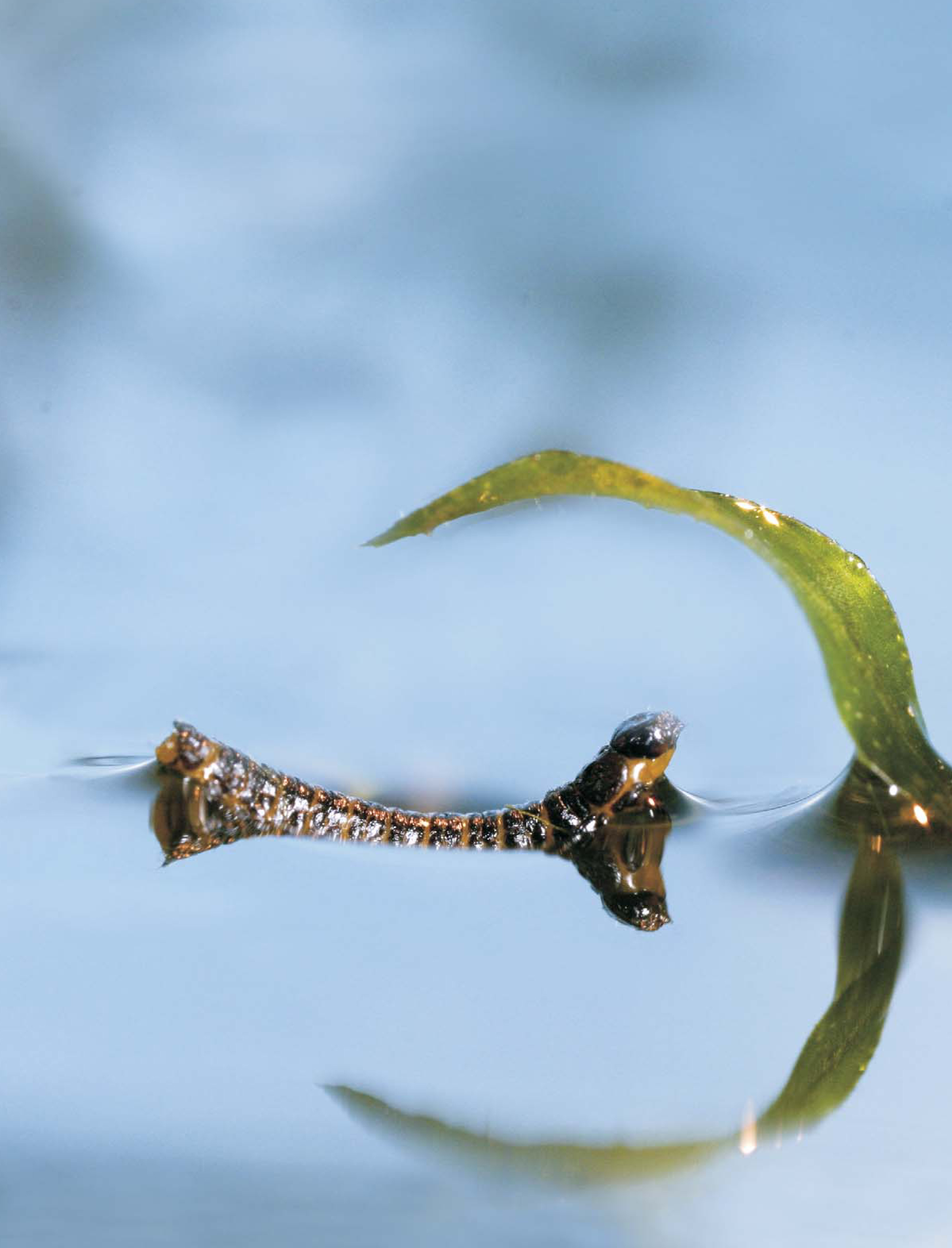 With its back arched, the beetle larva seen here generates its own menisci at either end of its six-millimeter-long body. The two menisci are attracted to that adjoining the leaf, and the resulting force on the larva takes it toward the overhanging leaf at speeds that can exceed 10 cm/s. Viewed in terms of energy balance, the increase in gravitational potential energy as the larva ascends toward the leaf is less than the increase in surface energy caused by the surface deformation. To learn more about meniscus climbers, see D. L. Hu, J. W. M. Bush, Nature 437 , 733 (2005) and J. W. M. Bush, D. L. Hu, Annu. Rev. Fluid Mech. 38 , 339 (2006).