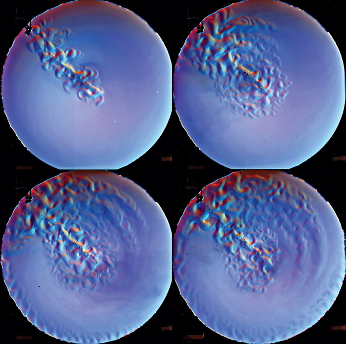 These images, taken by Yakov Afanasyev of the Memorial University of Newfoundland and colleagues over the course of 30 minutes, show the evolution of flows in a 1.1-meter-diameter water tank making 24 counterclockwise rotations per minute. The center of the tank corresponds to a planet’s North Pole; the rim, to the midlatitudes. A heater, visible at the rim at 10 o’clock, drives the flows, similar to how topography or thermal gradients might affect flows on a planetary scale. The observed variations in the water’s height, related to the subsurface flows, reveal jets, eddies, and planetary waves and provide insights into atmospheric and oceanic dynamics. (Images submitted by Yakov Afanasyev.)