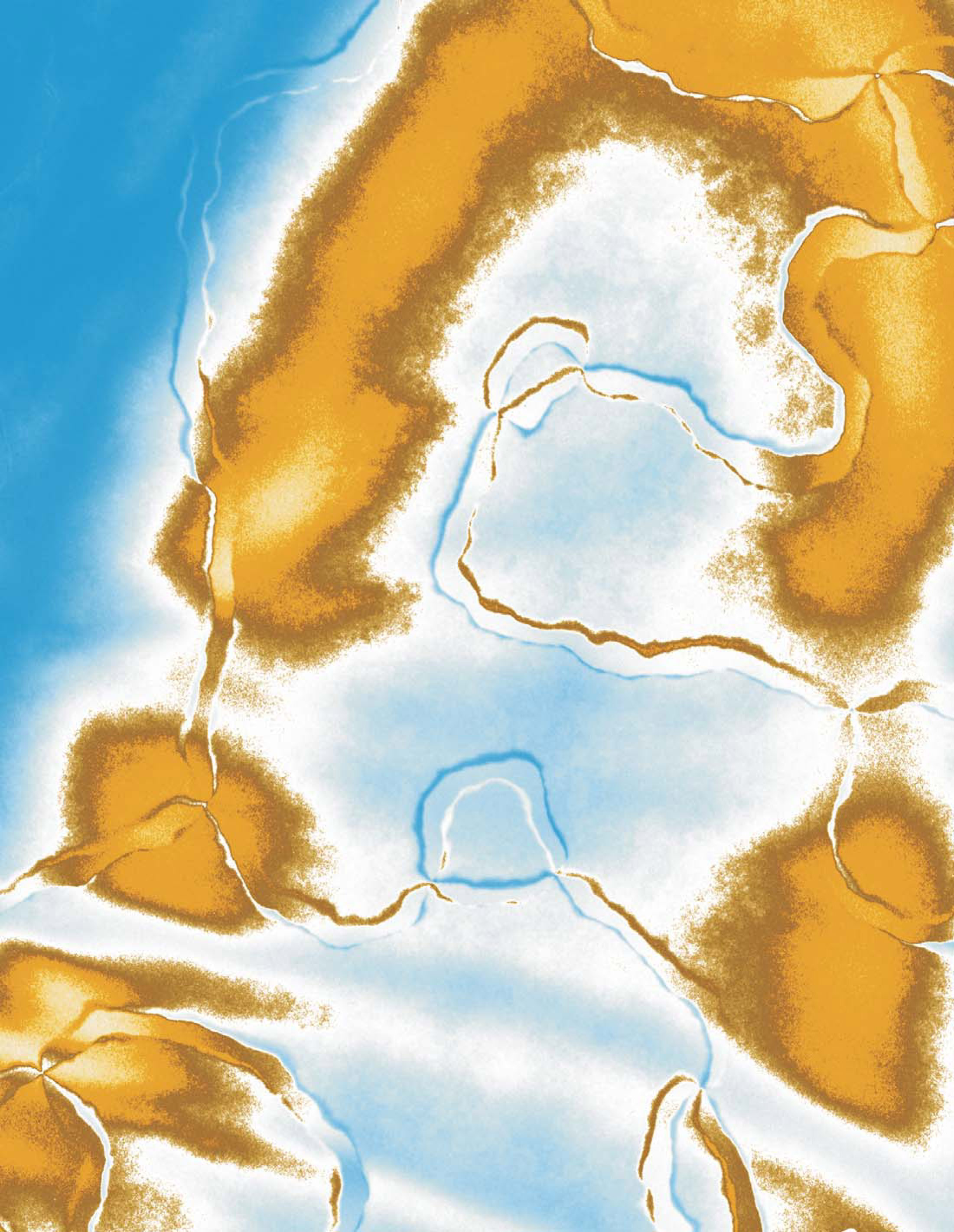 The yttrium manganite (YMnO3) shown in this colored transmission electron microscope image is a multiferroic with a hexagonal crystal structure. Below a critical temperature, it undergoes a spontaneous structural instability that leads to three structural domains, each of which can support two directions of ferroelectric polarization. Against the background variations in the image, the boundaries between the domains stand in sharp relief, casting blue, white, and brown shadows. The boundaries meet in cloverleaf arrangements that cycle through all six domain configurations. Occurring in pairs, the cloverleafs can be viewed as vortices and antivortices, in which the cycle of domain configurations is reversed. Vortices and antivortices are topological defects: Even in a strong electric field they won’t annihilate. (T. Choi et al., Nat. Mater. 9, 253, 2010 ).