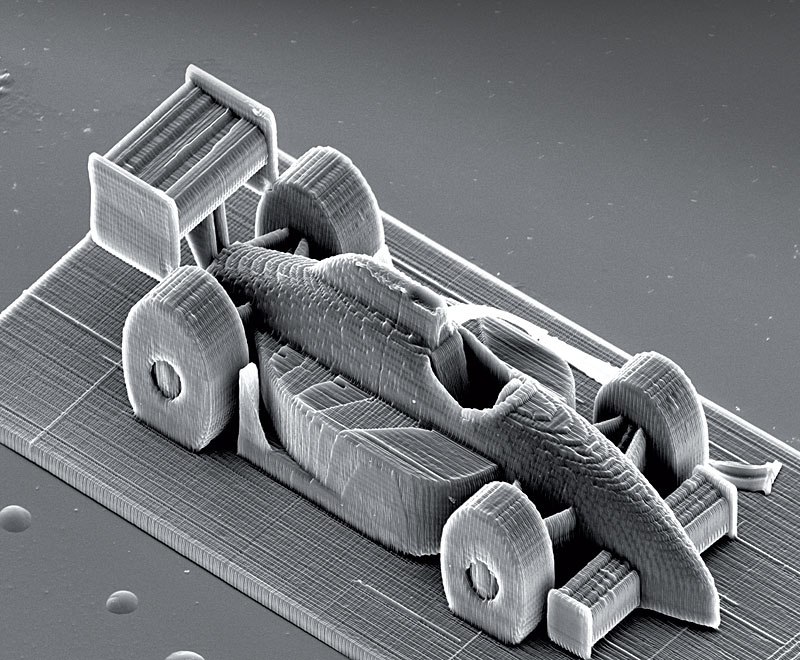 The Vienna technique relies on two-photon polymerization. Femtosecond pulses from an 800-nm laser are focused within a volume of light-sensitive resin. The pulse can trigger the polymerization of the resin, but the process requires the absorption of two photons. That only happens at the focal point, where the intensity is sufficiently strong. As the laser is scanned through the material, it leaves in its wake a solidified line a few hundred nanometers wide. Whereas layer-by-layer techniques constrain the assembly to the surface of the material, two-photon polymerization can occur anywhere in the resin volume. Large overhangs, such as the tail of this micron-scale racecar, can thus be produced.