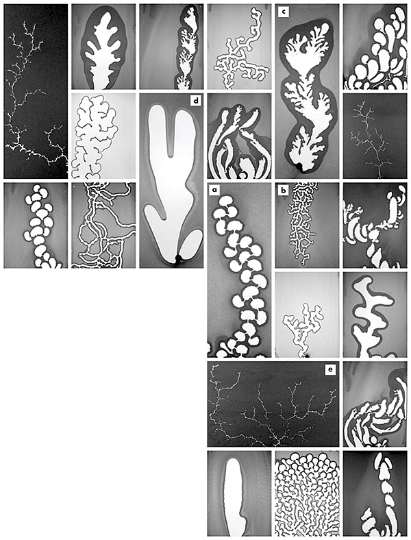 These images illustrate the diverse morphologies found in new work by Bjørnar Sandnes and colleagues at the University of Oslo and the University of Sydney. The experiment is simple: Air is injected into a generic mixture of granular material and fluid contained in a 500-µm gap between two parallel glass plates. At low injection rates, friction between the grains—glass beads averaging 100 µm in diameter—dominates the rheology, producing “stick–slip bubbles” (a) and labyrinthine frictional fingering (b). A transition to various other morphologies, including “corals” (c) and viscous fingers (d), emerges with increasing injection rates. At sufficiently high granular packing fractions, the material behaves like a deformable, porous solid, and the air rips through in sudden fractures (e). (B. Sandnes et al., Nat. Commun. 2, 288, 2011; images submitted by B. Sandnes.)