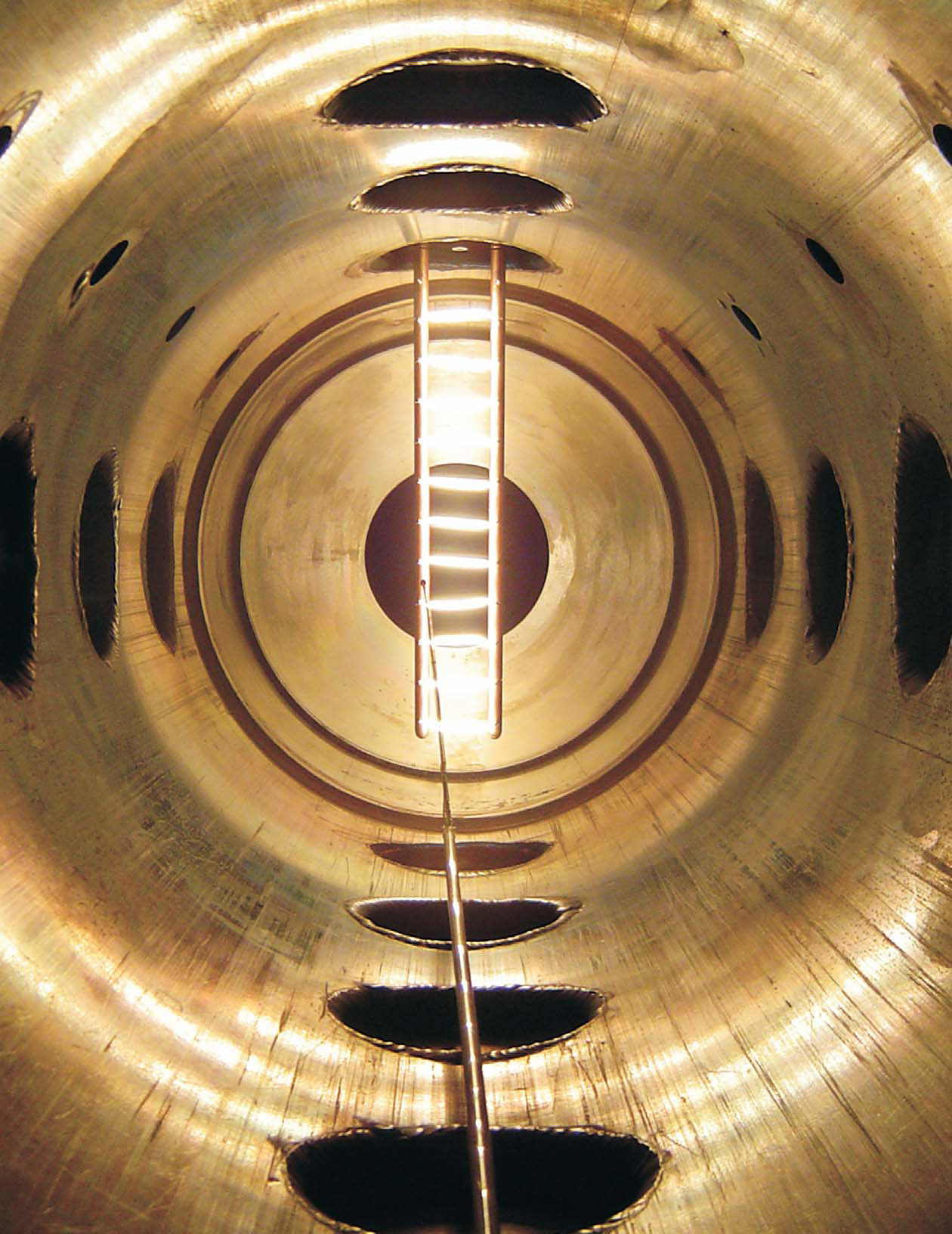 Eleven tungsten filaments are seen glowing white hot at one end of a cylindrical vacuum chamber (approximately 36 cm in diameter and 1.2 m in length) used in UCLA’s undergraduate experimental plasma course. Electrons emitted from the filaments are accelerated into the chamber wall and ionize background neutral gas. Unlike the prominent plasma discharge on this month’s cover, here the light emitted by the plasma is dwarfed by the intensity of light from the filaments. The lack of visible plasma phenomena in the chamber frequently causes students to question whether they have actually created a plasma. The plasma’s existence is confirmed through analysis of data the students obtain using Langmuir probes, like the one shown here approaching the filaments. (Image courtesy of David Pace.)