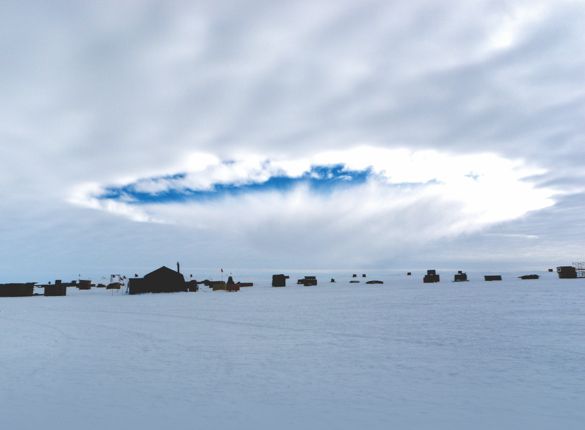 Airplanes flying sufficiently high overhead, where the temperature is −40 °C or colder, will leave familiar condensation trails, or contrails, as water vapor expelled in the plane’s exhaust forms droplets or ice particles. But that is not the only effect that planes leave in their wake. Planes passing through midlevel clouds can induce linear voids, known as canal clouds, and circular voids, called hole-punch clouds or fallstreak holes. Seen here is a hole-punch cloud over the West Antarctic ice sheet in December 2009. Gray streams of ice—the fallstreaks—are visible below the hole, which formed near the horizon and moved toward the camera. The hole was likely caused by a Lockheed LC-130 four-engine turboprop.