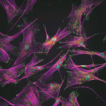 Andrés García and colleagues at Georgia Tech have now demonstrated a high-throughput microfluidic technique that in just a few minutes separates the iPSCs to purities approaching 99%, with a cell survival rate of 80%. The method exploits morphological changes that accompany the reprogramming. As befitting their structural role in the body, adult human fibroblasts adhere strongly to their environment. As shown here, actin filaments (purple) stretch tens of microns from each cell nucleus (blue) to numerous regions (green) that anchor the cell to its surroundings. In removing that specialized role, reprogramming also removes that specialized structure: The cells contract into spheres and adhere only about one-seventh as strongly to their surroundings. With such a different “adhesive signature,” the iPSCs could be robustly detached (and recovered downstream) by laminar flow through a microfluidic channel that the team placed over the cell culture. (A. Singh et al., Nat. Methods, in press, doi: 10.1038/nmeth.2437