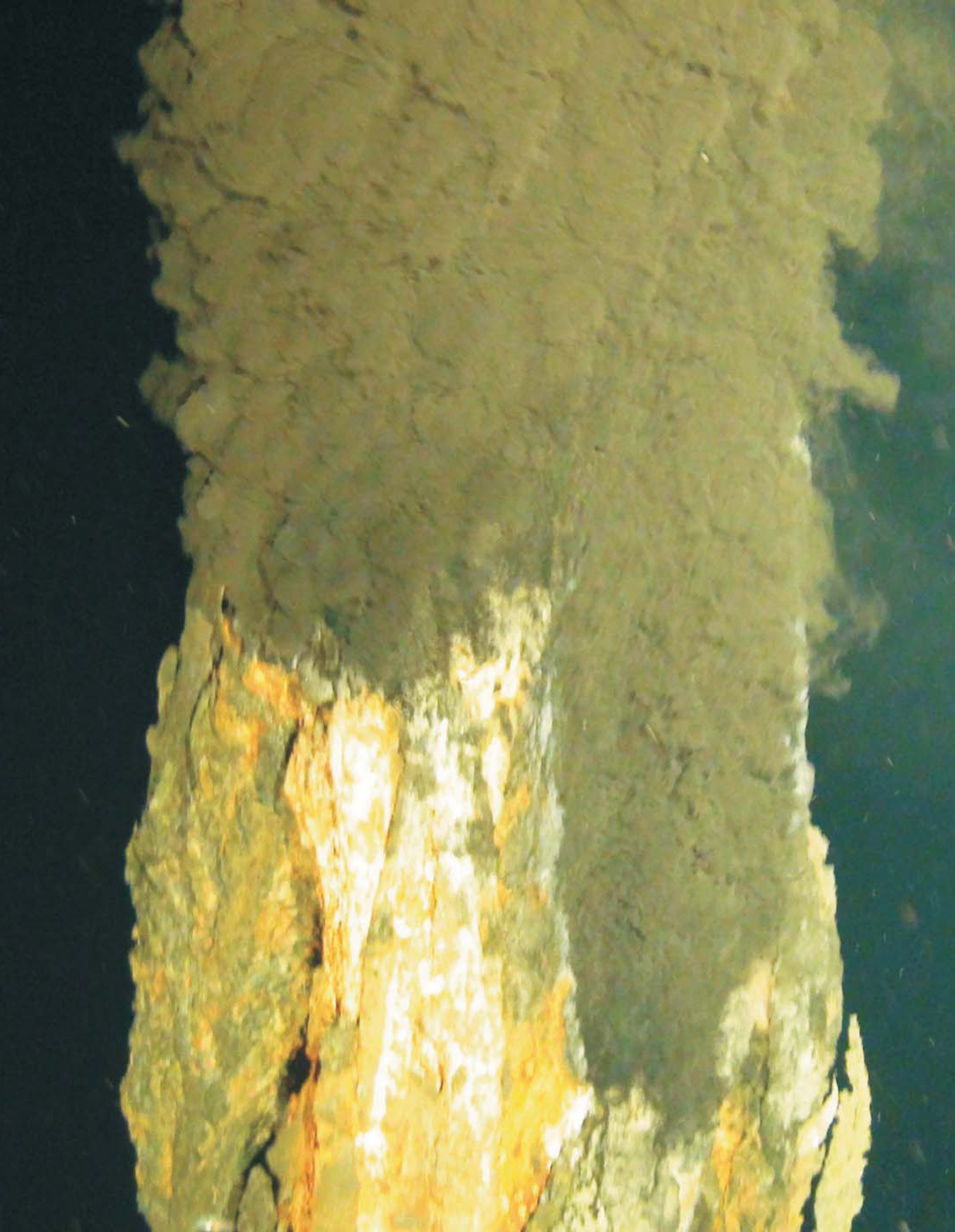 Deep-sea vents tend to be found at depths of 1.5-3 kilometers. First seen in the Pacific Ocean in 1977, the vents have fascinated scientists and the public with their unique and unexpectedly thriving ecosystems fueled by the mineral-rich scalding water they spew. That water can reach temperatures greater than 450 °C. Although the pressure at those depths keeps the erupting water from boiling, the minerals quickly precipitate out. At the newly discovered vents, copper and iron precipitates have formed chimneys (the top of one is seen here) that are some 6 meters tall but only 50-60 centimeters wide; other minerals give the black plume its characteristic color. Microbial mats cover the bases of the spires.