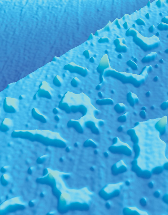 Shown here is an atomic force micrograph, 14 µm across, of water adlayers trapped under a graphene sheet. Under ambient conditions, the first adlayer forms atomically flat islands (lightest blue), typically tens of nanometers across. Remarkably, the islands are icelike at room temperature: Their facets have preferred angles near 120°, and each island has the same height (0.37 nm) as a single bilayer of crystalline ice. At high humidity levels, a second layer of water coats the first, also as ice. At even higher humidity levels, additional layers of water coat the surface as droplets. (K. Xu, P. Cao, J. R. Heath, Science 329, 1188, 2010.)