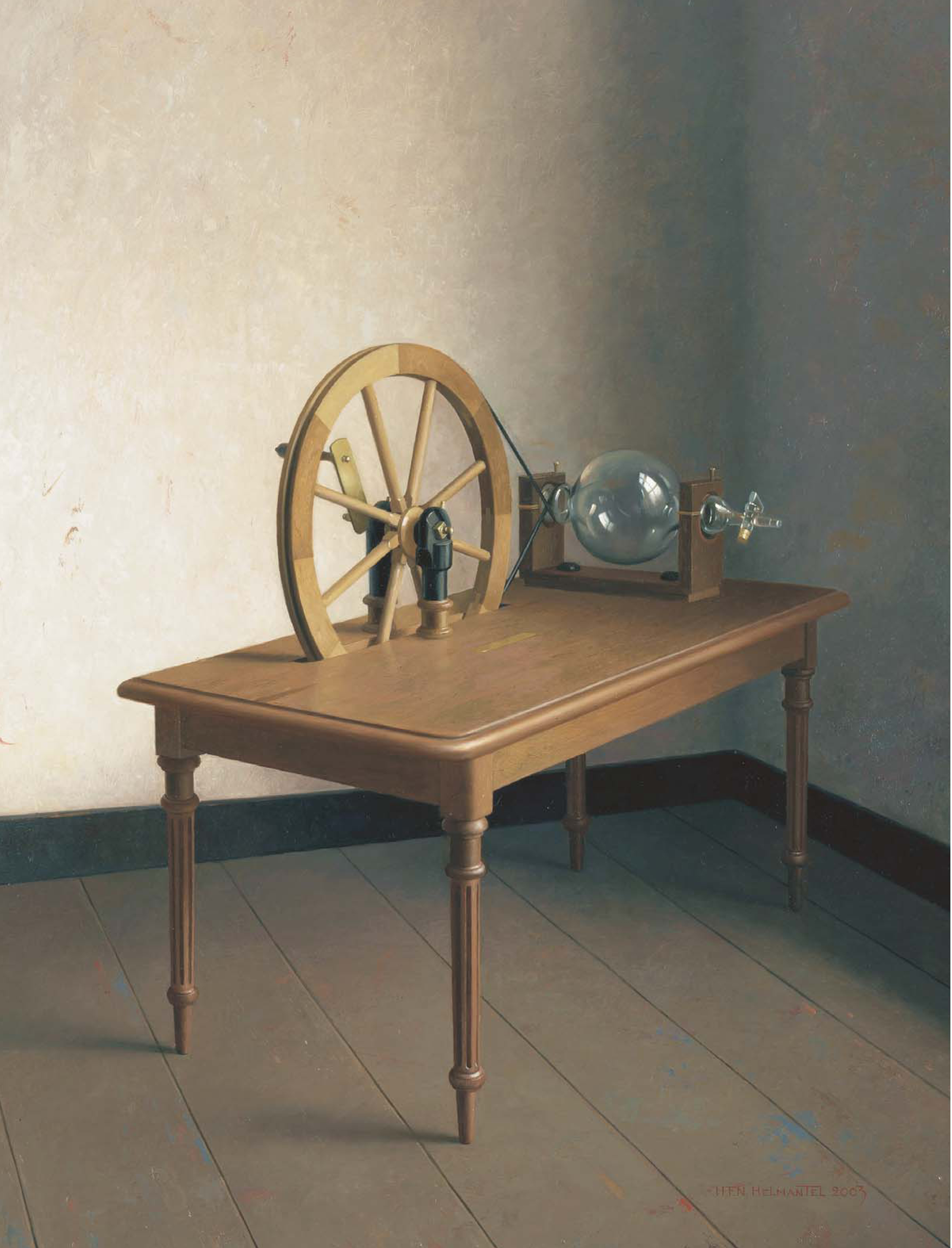 In 1676, French scientist Jean Picard noticed that when he moved his mercury barometer in the dark, a faint, diffuse, purplish light appeared around the meniscus—but only when the mercury in the tube moved downward, enlarging the vacuum space. Only some of the attempts to reproduce the effect were successful, and interest lapsed until 1700, when John Bernoulli at the University of Groningen demonstrated the importance of having the mercury purified and the meniscus clean. Bernoulli scaled up the effect by using a large glass vial evacuated with an air pump and sealed with a cork and wax; he called the vial his “perpetual phosphorus.” Six years later, in 1706, Francis Hauksbee in London went further, hooking up a glass globe, evacuated and partly filled with mercury, to a driving belt. Subsequent experiments showed similar effects with pieces of amber (“elektron” in Greek) inside the revolving globe and with dry sheep skin outside it. Furthermore, dry hands drew small sparks from an unevacuated globe. These early demonstrations of static electricity fueled the century’s investigations into the subject. Today’s Van de Graaff generator is a direct descendant.