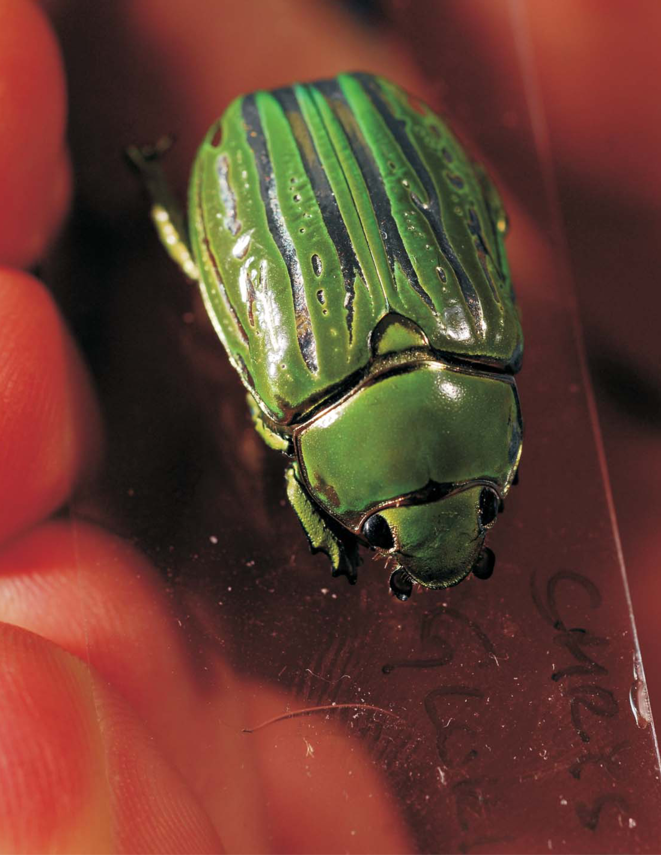 The brilliant metallic iridescence of so-called jewel beetles, such as the Chrysina gloriosa seen here, arises not from chemical pigments but from the physical structure of the beetles’ exoskeleton. The beetles share that morphological trait with several other creatures, including butterflies, birds, and fish (see Physics Today, October 2006, page 82