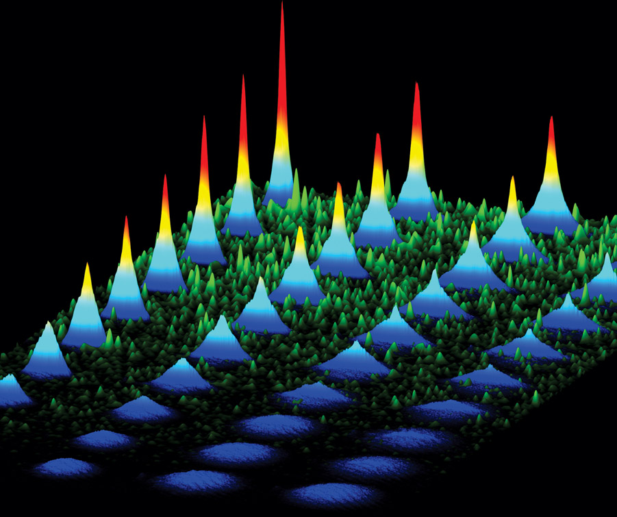 This plot captures the results of several experimental runs. The disorder was created by optical speckle in a green laser that passed through a trapped cloud of potassium-40 atoms; the green background, increasing from bottom to top, indicates the strength of that disorder. Temperature increases from left to right, and the islands represent the 2D projections of the atom density shortly after the cloud is released from the trap. In a feature unique to 3D localization, the projections show two components.At low disorder there are only broad bases, but as the disorder strengthens and the temperature decreases, sharp peaks appear on top of them. The peaks comprise the localized atoms, which stay stationary over time while the higher-energy, nonlocalized atoms in the base diffuse away. The control afforded by the experimental setup could shed new insights into 3D localization and the role of interparticle interactions. (