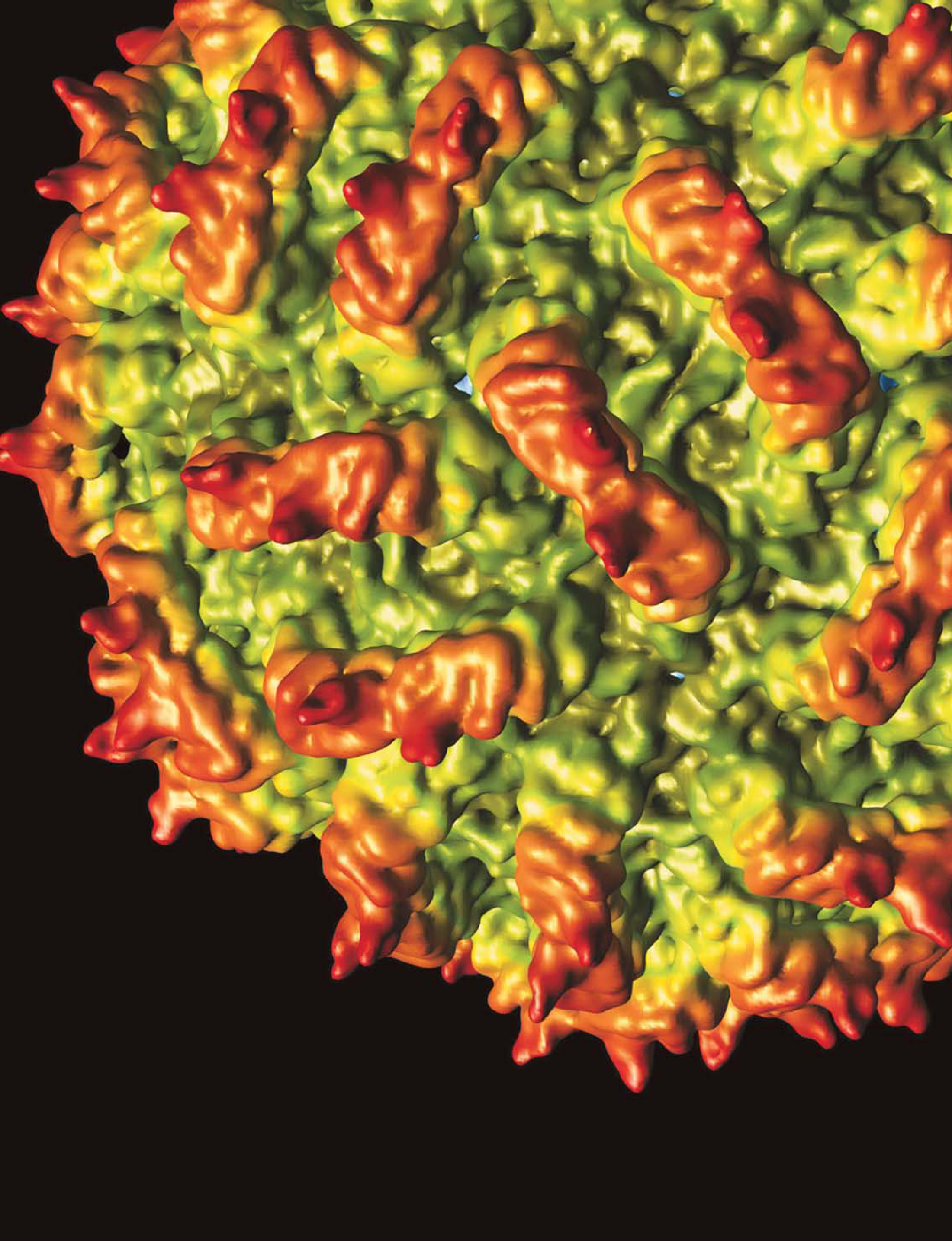 New work has determined the three-dimensional capsid structure of two members of the family Partitiviridae, one of the last dsRNA families to have its structure solved. Shown here is the Penicillium stoloniferum virus S, resolved to 7.3 Å and colored by radius. The 3D reconstruction was assembled from 14 246 individual particle images obtained with cryoEM. The 35-nm-diameter capsid is marked by 60 protruding arches, each formed by a protein dimer. A subtly different arched structure was found for the related P. stoloniferum virus F and resolved to 3.3 Å by x-ray crystallography. (W. F. Ochoa et al. Structure 16 , 776, 2008 http://dx.doi.org/10.1016/j.str.2008.02.014