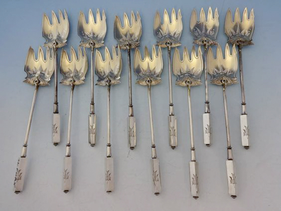 A set of 19th-century terrapin forks made by Gorham in its Egypt-inspired Isis pattern. (Image courtesy of Antique Cupboard, Big Bend, Wisconsin.)