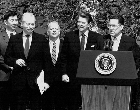 Rose Garden ceremony. Secretary of energy John Herrington (at lectern) and President Ronald Reagan (next to him) stress the importance of building the Superconducting Super Collider to an audience of top high school students, Nobel laureates, and others on 30 March 1988. Joining them, from left, are Samuel Ting (MIT), Steven Weinberg (University of Texas at Austin), and Burton Richter (then director of SLAC). (Courtesy of the Ronald Reagan Presidential Library.)