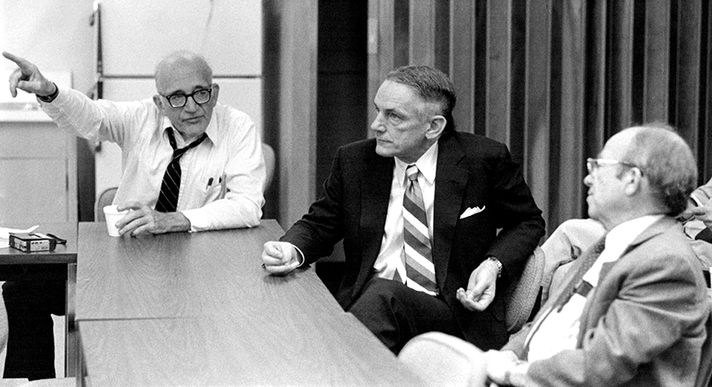 SLAC deputy director Sidney Drell (left) and emeritus director Wolfgang Panofsky (right) talk in late 1992 with Louisiana senator J. Bennett Johnston, the Superconducting Super Collider’s leading supporter in Congress. (Courtesy of Ed Souza, Stanford News Service.)