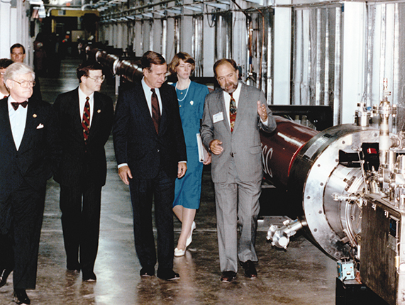 Superconducting Super Collider director Roy Schwitters (right) guides President George H. W. Bush (center) on a tour of the SSC magnet test laboratory on 30 July 1992. Accompanying them are, from left, presidential science adviser D. Allan Bromley, Texas congressman Joe Barton, and deputy undersecretary of energy Linda Stuntz. (Courtesy of Fermilab Archives.)
