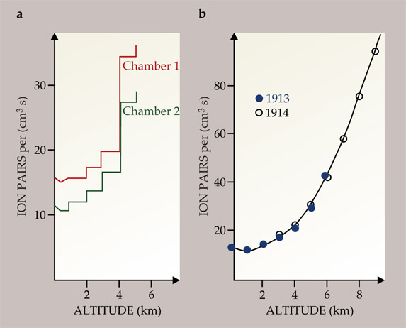 Figure 3. The rate of atmospheric ionization as a function of altitude, as measured (a) by Victor Hess on 7 August 1912, and (b) by Werner Kolhörster in 1913. (Adapted from ref.