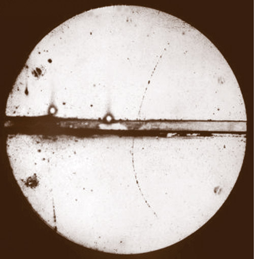 Figure 4. A historic cloud-chamber photograph taken by Carl Anderson in 1932 shows a positive particle, presumably from a cosmic-ray shower, entering from the top, curving in the chamber’s transverse magnetic field, and losing energy in the lead plate. After traversing the plate, the track is much too long for a proton of that curvature. Also, the weak ionization density along the track indicated a particle much lighter than the proton. This was the first sighting of the positron proposed by Paul Dirac in 1928. (Adapted from ref.