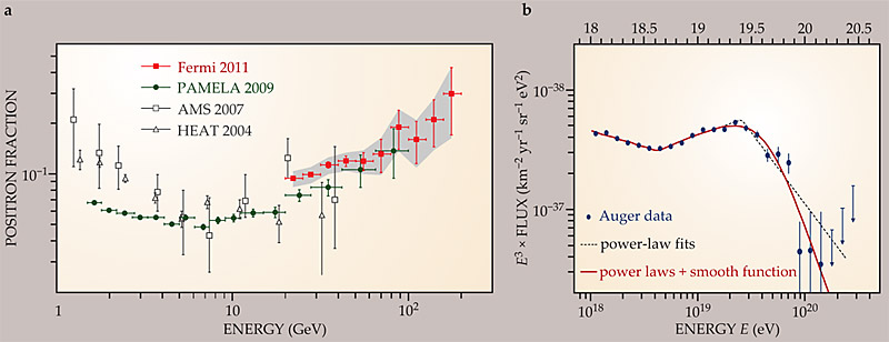 The existence of antimatter islands in the cosmos is no longer seriously considered. But there are other, somewhat less exotic scenarios for the appearance of more antiparticles in cosmic rays than can be explained by ordinary interstellar collisions. Such an antimatter surprise came in 2009, when the orbiting PAMELA spectrometer recorded data on the flux of cosmic-ray positrons. 15 If cosmic-ray positrons are produced in interstellar collisions of known particle species, the positron-to-electron ratio should decrease slowly with increasing positron energy. Instead, the ratio observed by PAMELA increased with energy from 5 GeV to 100 GeV. That unanticipated rise has now been confirmed and extended up to 200 GeV by NASA’s Fermi orbiter, 16 as shown in figure 5a. The growing positron excess may come from high-energy stellar sources such as pulsars or from annihilations of still-unidentified dark-matter particles.