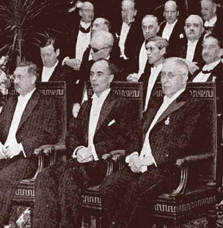 At the ceremony, Hess (right) and Anderson (middle) are seated beside chemistry laureate Peter Debye. (Image courtesy of the Nobel Foundation.)