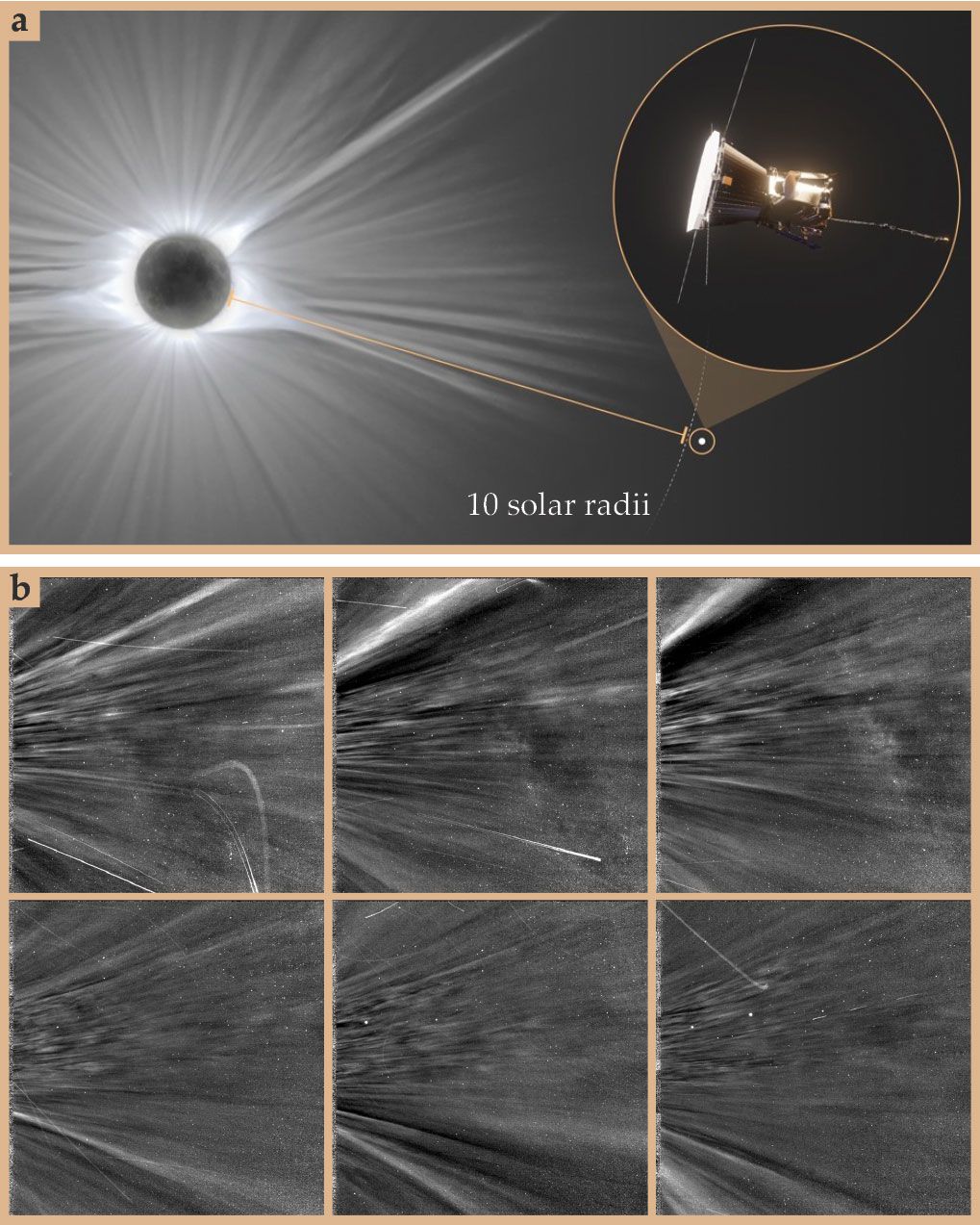 The Parker Solar Probe, (a) as depicted in this illustration, flies through coronal structures like those visible during total eclipses. (b) Images from the spacecraft’s WISPR instrument show the spacecraft gliding above and below the structures of the solar corona. That upward and downward motion of coronal features, however, is only apparent. (Courtesy of NASA/Johns Hopkins APL/Naval Research Laboratory.)