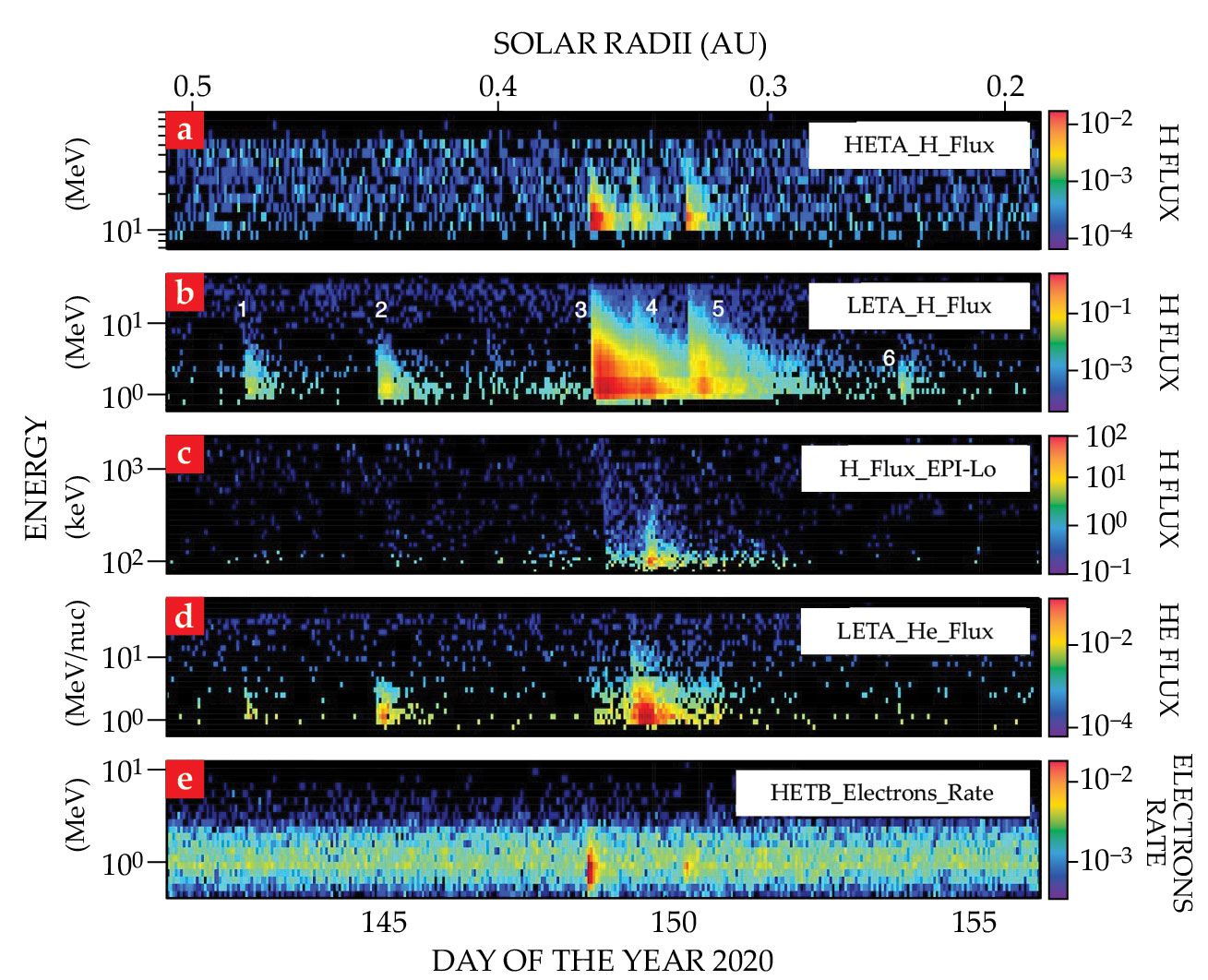 Energetic particles near the Sun were observed by the Parker Solar Probe’s IS☉IS suite. The spectrograms indicate the proton intensity (panels a, b, and c); the helium intensity (panel d); and the electron-count rate (panel e). High Energy Telescope (HET) A, Low Energy Telescope (LET) A, Energetic Particle Instrument-Low (EPI-Lo), and HETB are sensors of the IS☉IS suite. (Adapted from ref.