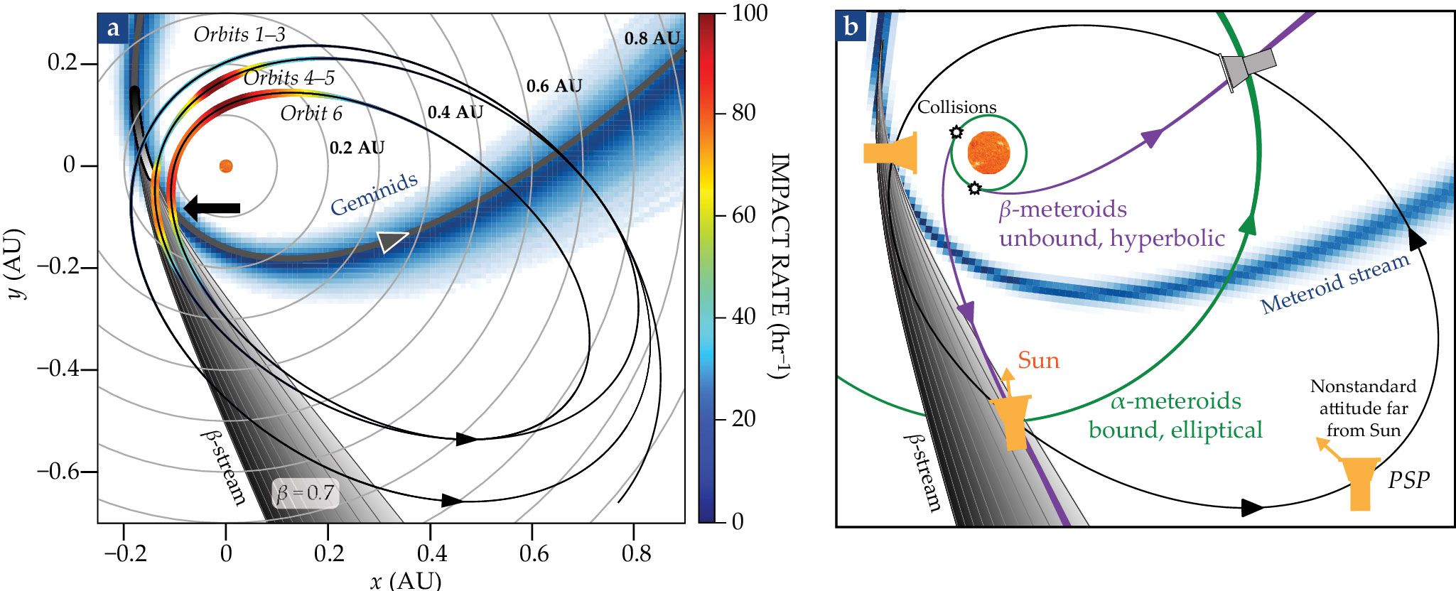 Dust in the inner heliosphere and (a) dust-impact rates were measured by the Parker Solar Probe’s FIELDS electric antennas and are overlaid here on the PSP trajectory for orbits 1–6. (b) Several dust populations (not drawn to scale) were identified using the PSP measurements: gravity-bound α-meteoroids, unbound β-meteoroids, and a potential dust stream, known as a β-stream. The gray fanlike feature is a new dust stream produced by interactions between the Geminids meteor trail and the zodiacal dust cloud. (Adapted from ref.