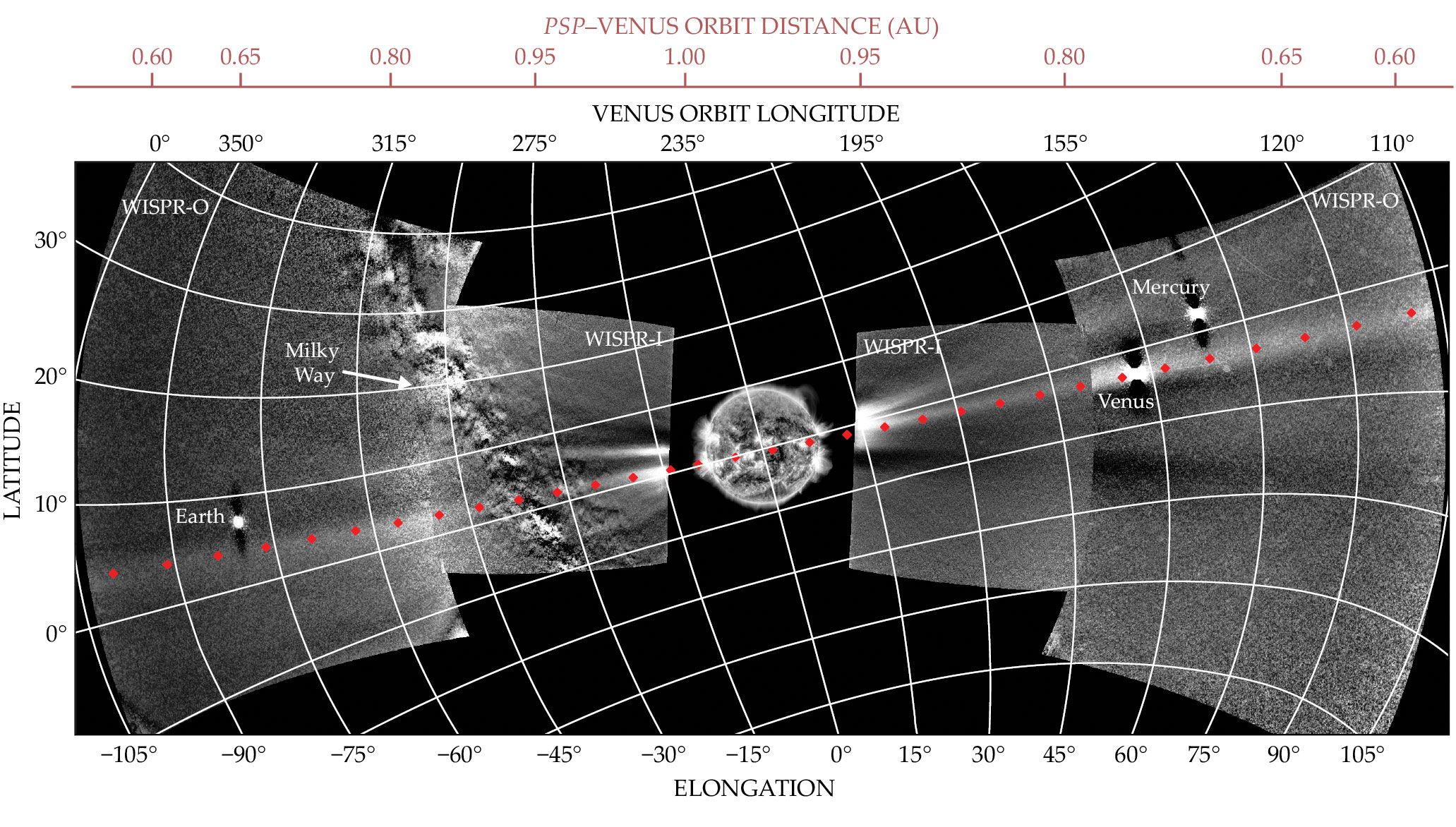 A circumsolar dust ring, identified by the faint emission along the orbit of Venus (red dotted line), was first observed by the Parker Solar Probe. The spacecraft’s WISPR sensor collected the images during the extended campaign that preceded the fourth perihelion encounter. The Sun—not to scale and masked by the spacecraft’s heat shield—is the disk at the center. The images on the right- and left-hand sides are in the direction of the spacecraft’s motion and the opposite motion, respectively. (Adapted from ref.