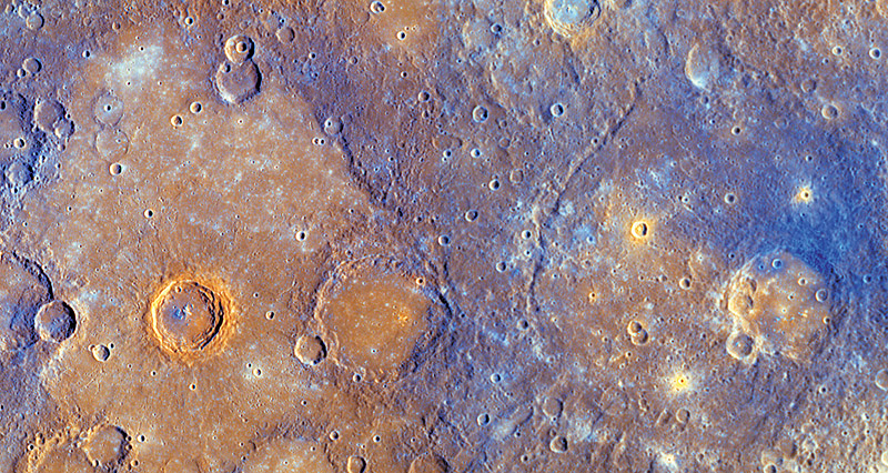 Figure 2. Mercury’s near-equatorial region, shown in enhanced color from MESSENGER’s second flyby. The image illustrates some of the relationships between color and geological features—in particular, how impact craters can serve as probes of the variation of crustal composition with depth. At right, the floor of the 121-km-diameter Titian crater, named for the Italian Renaissance painter, is coated with material brighter in orange than the surrounding area. Material ejected from the crater appears blue, which represents a different composition. At left, Calvino crater, named for the 20th-century Italian writer, formed from an impact into the brown-appearing Rudaki plains; the impact explosion excavated the bright orange material that makes up the crater rim. The blue material on the crater’s central peak is thought, on the basis of crater-formation models, to have been excavated from still greater depth. (Courtesy of NASA/Johns Hopkins University Applied Physics Laboratory/Carnegie Institution of Washington.)