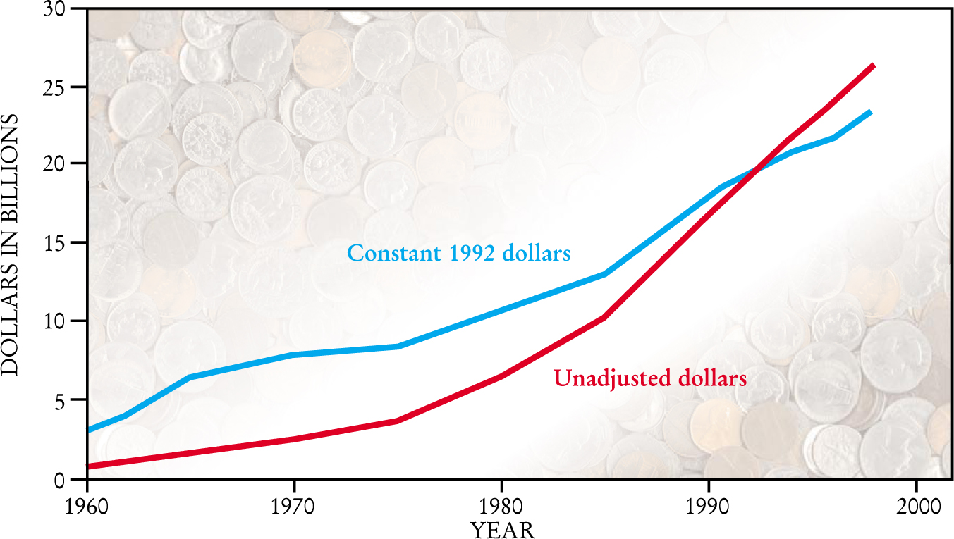 Figure 1. Support for US academic research over the period 1960–98 in dollars unadjusted for inflation (red) and in constant 1992 dollars (blue). The curves reflect contributions from federal, state, and local governments; academic institutions; industry; and other sources. Data are from ref. 2, chap. 6.
