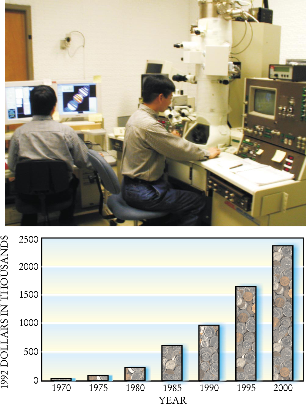 Figure 2. The transmission electron microscope (TEM) is significantly more sophisticated and expensive than it was 30 years ago. (a) This modern TEM incorporates many imaging, diffraction, and analytic techniques, and requires two scientists to operate it. (b) The costs of a TEM over the period 1970–2000 in constant 1992 dollars. The increasing costs reflect the increasing sophistication of the instrument.