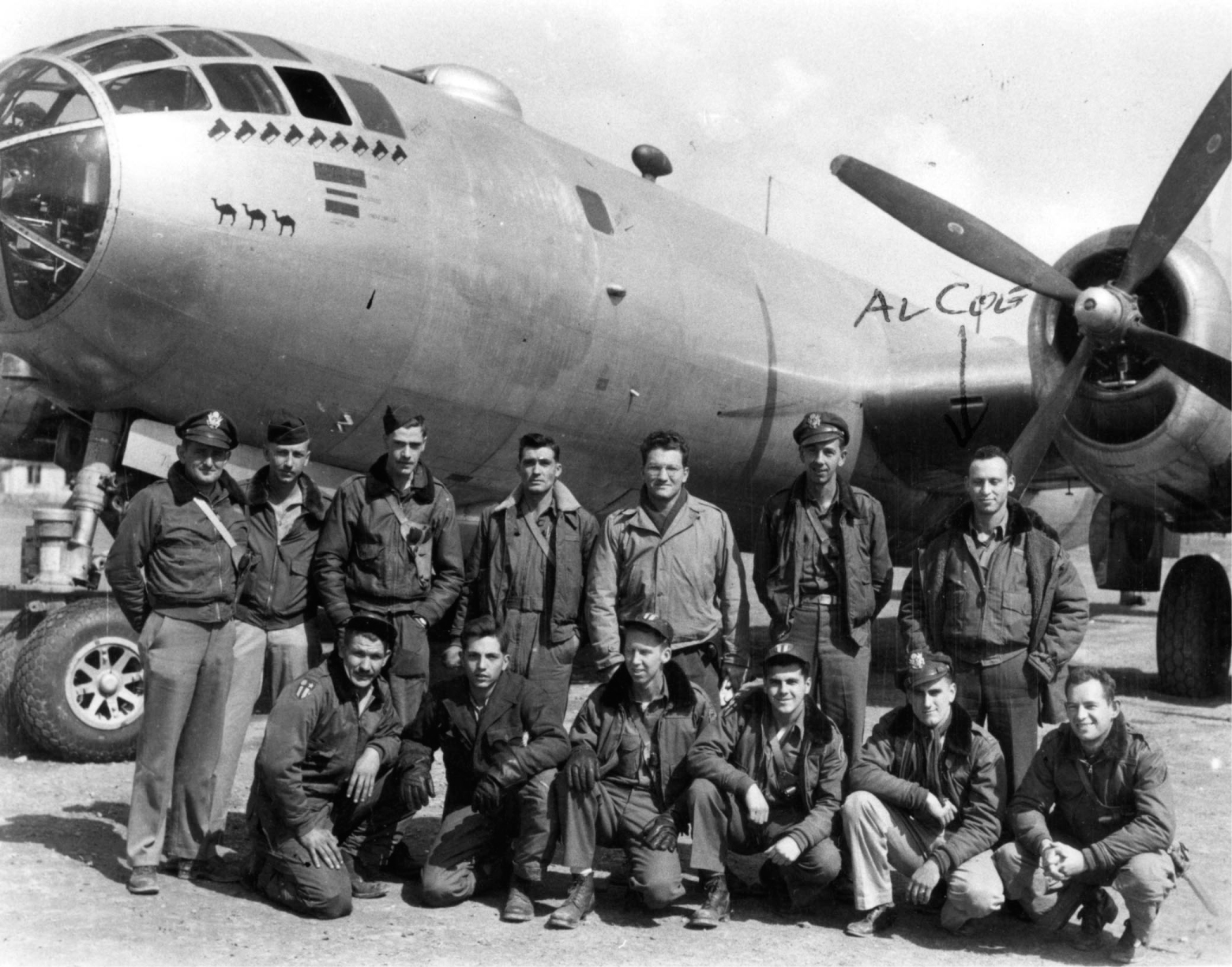 Figure 2. Crew of the B-29 reconnaissance mission that found the missing Japanese fleet on 12 March 1945. The photo was taken after a harrowing emergency landing at a Flying Tiger base in Xian, China. Captain Alvin Coe is at the far right in the top row, and the author (with eyeglasses) is the second man to his right.