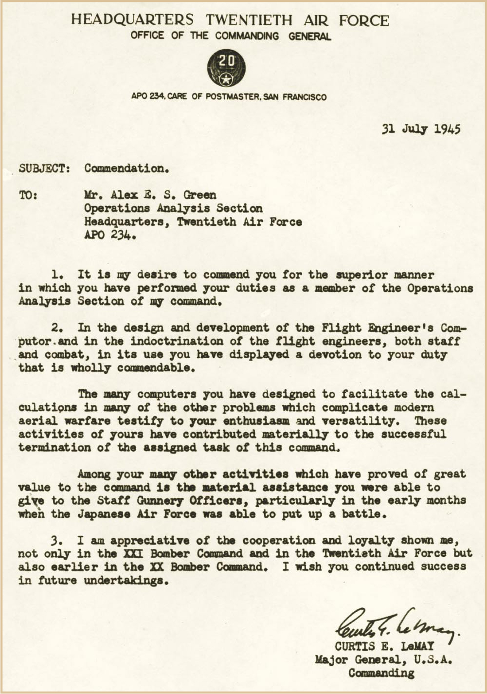 Figure 4. Letter from General Curtis LeMay to the author, dated just a week before the atomic bombing of Hiroshima. LeMay commanded the 20th Air Force, which encompassed both the 20th and 21st Bomber Commands.