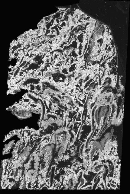 Figure 1. A section of rock sponge from the Lost City Hydrothermal Field located on the seabed at 30° N near the Mid-Atlantic Ridge. The sponge’s narrow fissures and its location near a heat source provide two ingredients—tight confinement and a thermal gradient—needed to concentrate prebiotic molecules. (Courtesy of Deborah Kelley, University of Washington.)