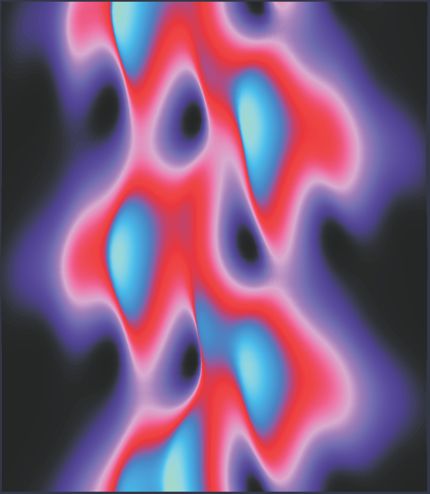 Figure 2. A streak image of a simulated ultrafast pump–probe experiment that explored how the kinetic energy (displayed in false color on the horizontal axis) of UV-induced Auger electrons changed with the delay (vertical axis) between attosecond pump pulses and femtosecond probe pulses. Color represents electron intensity. This image, which appeared on Physics Today’s