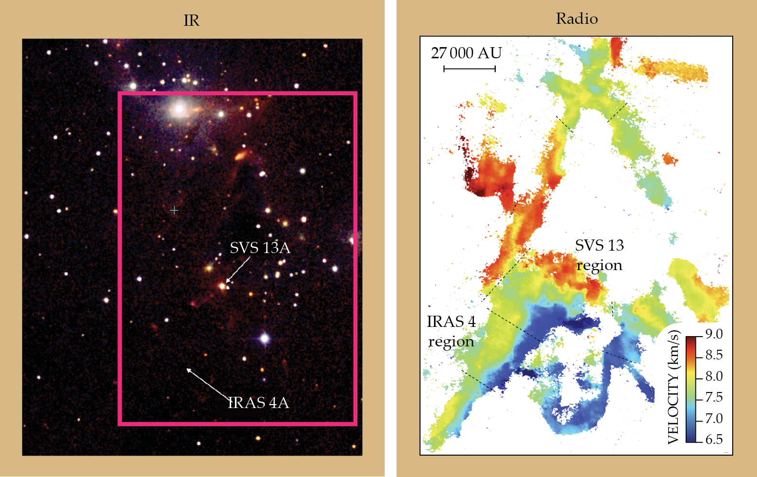 The molecular cloud NGC 1333 is one of the closest stellar nurseries to Earth. It is too cold to be seen in visible light, and only a few of its protostars—SVS 13A and IRAS 4A—appear in the IR (left). Instead, radio observations (right) are used to see the molecular cloud and its movement in the line-of-sight direction. NGC 1333 is being shattered by interstellar shocks pushing different parts of the cloud at different speeds and in different directions. (Adapted from ref.
