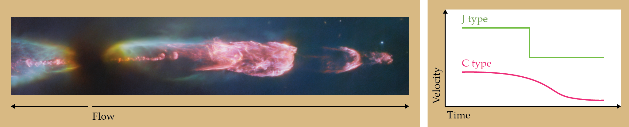 Two supersonic jets (left) emanating from a young protostar (here, HH 211, imaged in the IR) in opposite directions are shaped by various shocks erupting from the birth of the star. The jets flow away from the star, with the farthest gas being the first to escape. Shock types (right) exist on a spectrum that ranges from jump shocks (J type) to continuous shocks (C type); which type of shock depends on how gradually the velocity decreases over time. A smoother velocity change indicates the presence of a magnetic field.