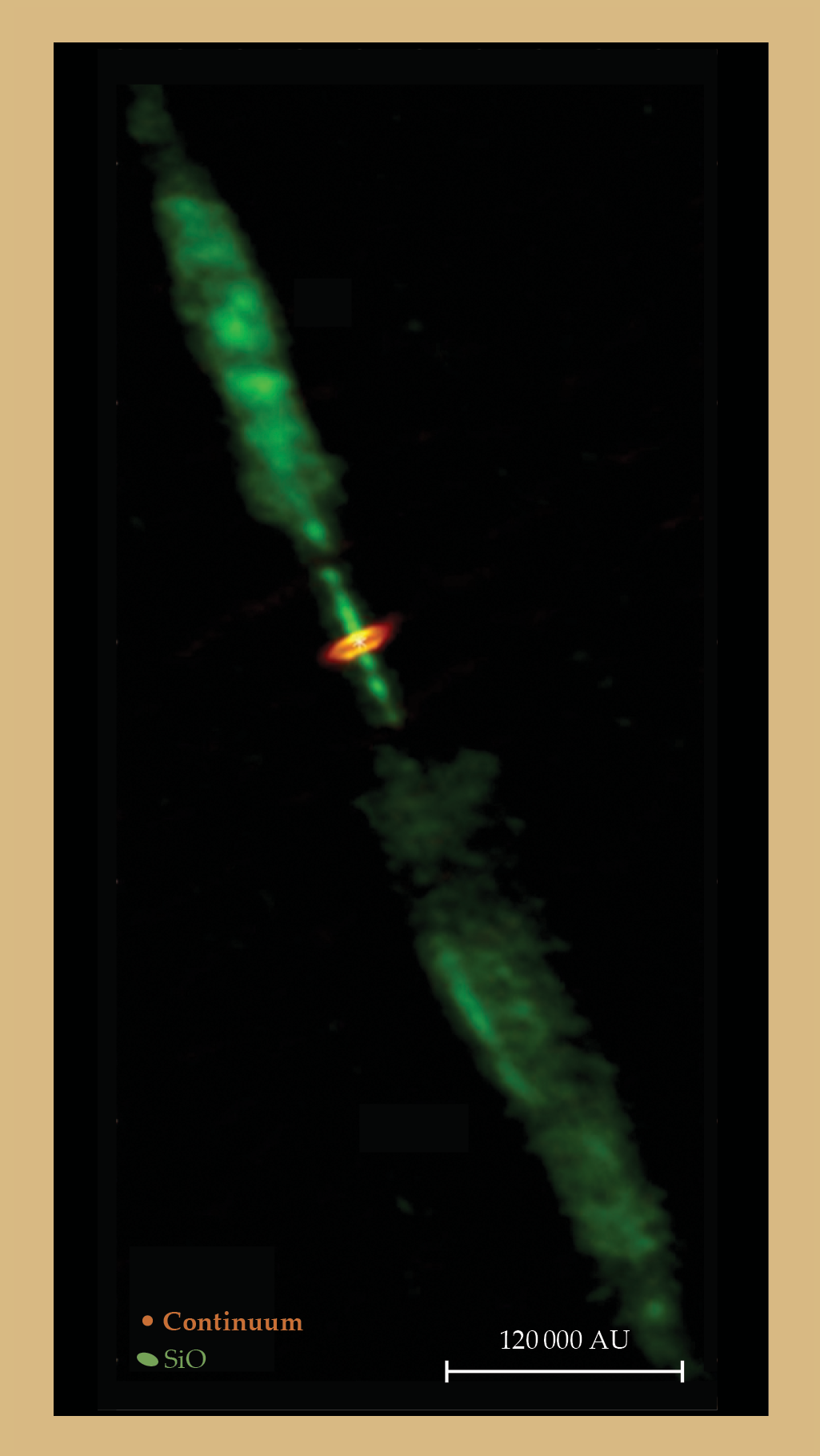 The shocked gas in the jet and outflow emanating from the young protostar HH 212-mm, shown in continuum light, is traced by silicon monoxide, abundant because the shocks caused by the jet sputter and shatter silicate grains in the interstellar medium. The silicon liberated from the grains is quickly oxidized into SiO, which can be easily observed with ground-based radio telescopes. (Adapted from ref.