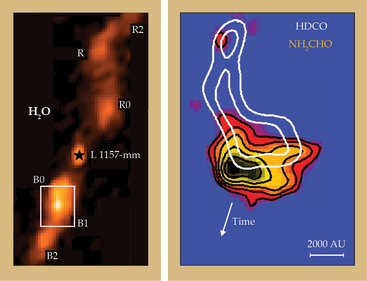 Formamide (NH2CHO) is an astrobiologically important molecule that is also formed in interstellar shocks. The molecular outflow in different regions of the protostar L 1157-mm (left) is traced by water. The B1 region (right) is abundant with deuterated formaldehyde (HDCO), indicated by the white contours. The fact that the contours of HDCO lag behind those of NH2CHO, indicated by black contours, means that the former was created after the passage of an older shock. (Left image adapted from ref.