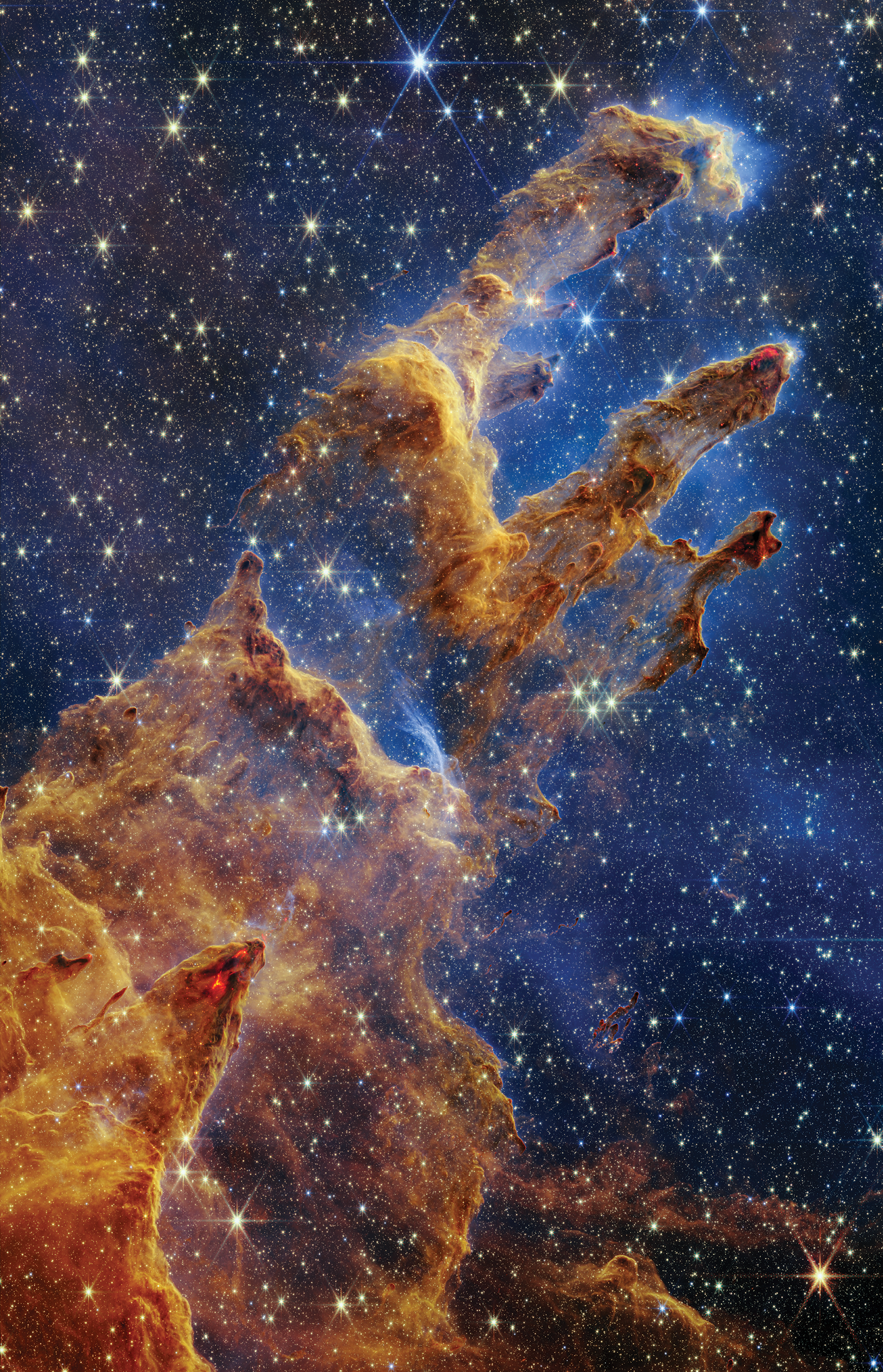 The picture to the right, taken in the IR by the James Webb Space Telescope, shows the region called the Pillars of Creation in the Eagle Nebula. The region contains many molecular clouds, where several star and planetary systems are in the process of forming. Because this image was taken using IR wavelengths, we can see through much of the dust to the young stars within.