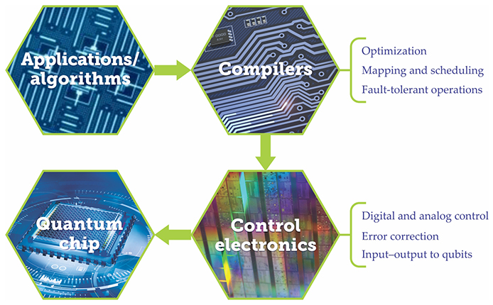 Functionalities necessary for a quantum computer are shown here. An application-driven design will help determine how to create a system that will accelerate algorithms from a particular application area. (Applications/algorithms: Jay M. Gambetta, Jerry M. Chow, and Matthias Steffen, CC BY 4.0; compilers: iStock.com/Bet_Noire; control electronics: Steve Jurvetson, CC BY 2.0; quantum chip: Yurchanka Siarhei/Shutterstock.com.)