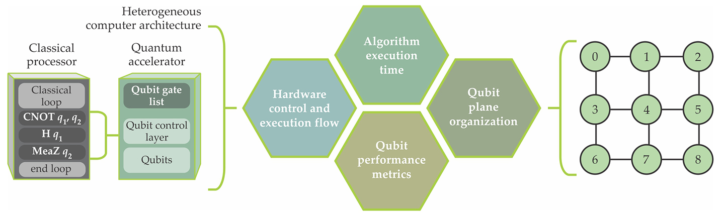 Researchers consider four interacting categories of functionalities when designing a system capable of running a quantum algorithm automatically on real qubit devices. For example, the connectivity of the qubits, as shown on the right, may influence the number of control lines that connect to the qubits in the cryogenic refrigerator. The left side shows how the quantum coprocessor may interact with the classical processor.
