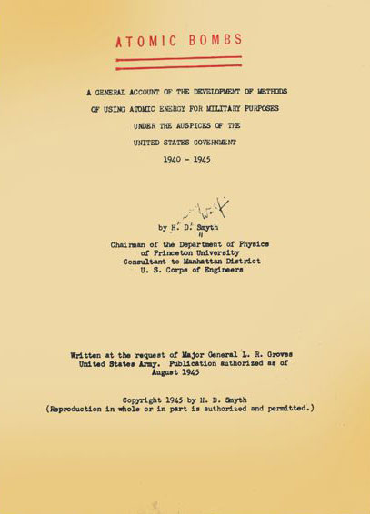 The Smyth report was known after its author Henry DeWolf Smyth because its official title, “A general account . . . ,” was too long and bureaucratic sounding. But the report was intended to be called “Atomic Bombs,” with the rest being a subtitle. Leslie Groves, director of the Manhattan Project, was so afraid the title would leak out, however, that he directed the title “Atomic Bombs” be applied with a rubber stamp just before distribution. But in the haste after the use of the bombs, the covers were almost never stamped. This rare edition has the stamp affixed. (Courtesy of the Library of Congress.) When the report was published in book form by Princeton University Press, the title was changed yet again, to Atomic Energy for Military Purposes.