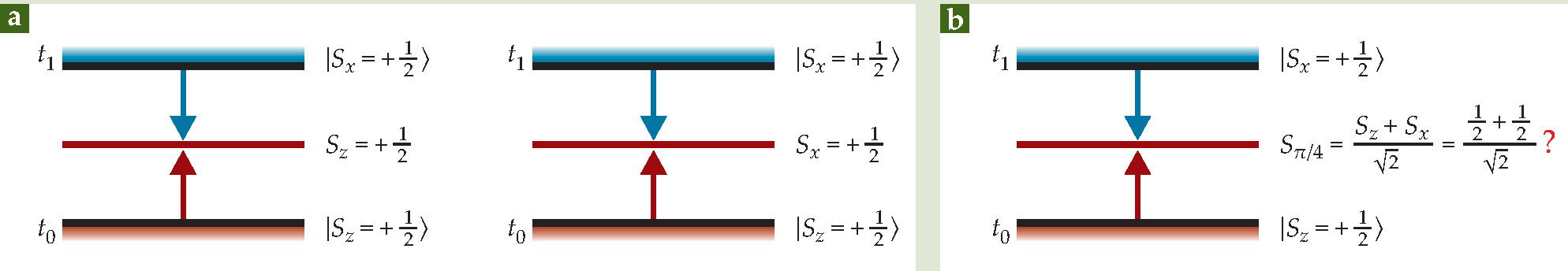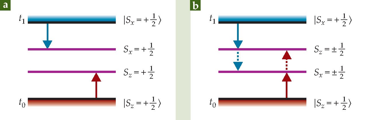 Isn’t that a quantum mechanical impossibility? How do we know that both spin components are completely determined? Well, suppose the Hamiltonian is zero (no magnetic field) so that the spin doesn’t precess. Then, if at t we measure the spin in the z-direction we must find it up, because that’s how the particle was prepared at t 0. On the other hand, if at t we measure the spin along x, we must also find it up, because otherwise the measurement at t 1 wouldn’t find it up (see figure 1a).