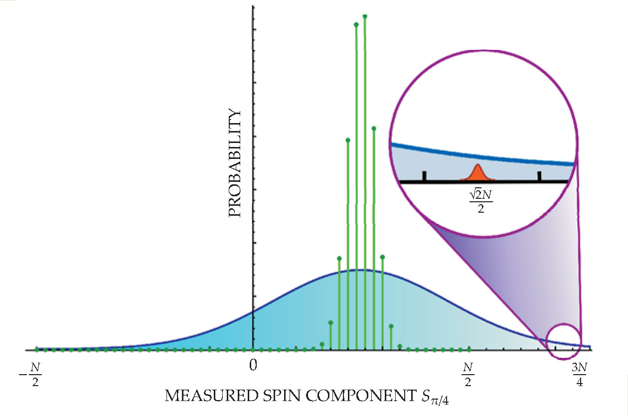 How is it possible that the measuring device indicates such a value for the spin? It’s all a game of errors. A perfect measurement will yield, by definition, only one of the eigenvalues of the spin operator: values of k/2, where k is an integer such that −N ≤ k ≤ N. But we’re now talking about an imperfect measurement with finite precision. So we don’t require the measuring device’s pointer to indicate precisely an eigenvalue. Sometimes it can even point, in error, to a value far outside the range of possible eigenvalues.