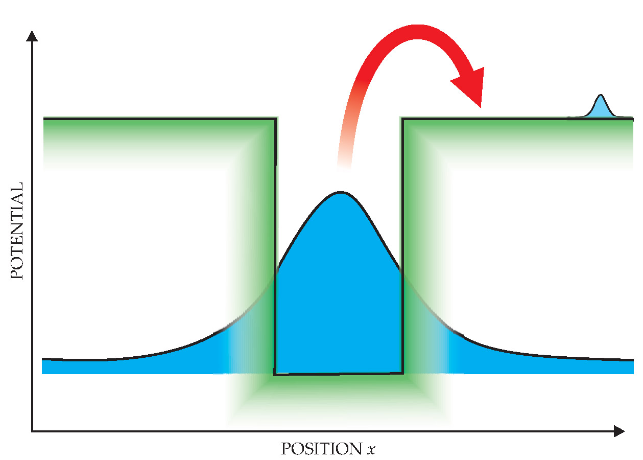 Figure 4. Preparing “genuine” tunneling particles. A quantum particle is preselected to have a particular total energy less than the depth of the potential well (green). The large bell-shaped curve shows its initial distribution in position x. But the particle is later postselected to have x far outside the well (small curve). In the interim between selections, a weak, imperfect measurement of the particle’s kinetic energy K will always yield an “impossible” negative K—if the measurement’s possible perturbing effect on position (red arrow) falls well short of the postselected x.