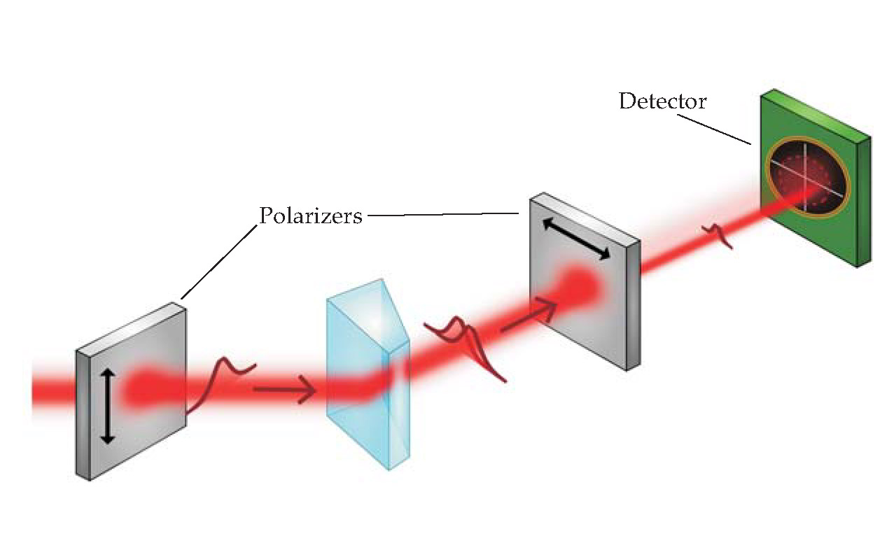 Figure 5. Amplifying the quantum Hall effect for light by weak measurement with pre- and postselection. The QHE produces a tiny lateral displacement of the light beam whose direction depends on whether the light is left- or right-circularly polarized. The beam undergoes the displacement while traversing the prism sandwiched between two polarizers. The polarizers, almost but not completely crossed, perform the pre- and postselection. As a result of those selections, the detector sees a beam that’s much fainter but has a much greater QHE displacement.