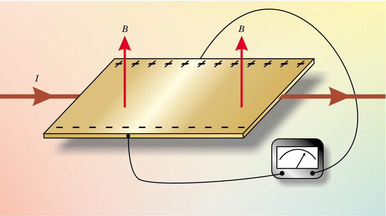 Figure 1. Edwin Hall’s 1878 experiment was the first demonstration of the Hall effect. A magnetic field B normal to a gold leaf exerts a Lorentz force on a current I flowing longitudinally along the leaf. That force separates charges and builds up a transverse “Hall voltage” between the conductor’s lateral edges. Hall detected this transverse voltage with a voltmeter that spanned the conductor’s two edges.